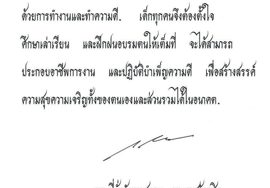 “ความสุขความสบายทั้งหลายนั้น เกิดขึ้นได้ด้วยการทำงานและทำความดี เด็กทุกคนจึงต้องตั้งใจศึกษาเล่าเรียน และฝึกฝนอบรมตนให้เต็มที่ จะได้สามารถประกอบอาชีพการงาน และปฏิบัติบำเพ็ญความดี เพื่อสร้างสรรค์ความสุขความเจริญทั้งของตนเองและส่วนรวมได้ในอนาคต”