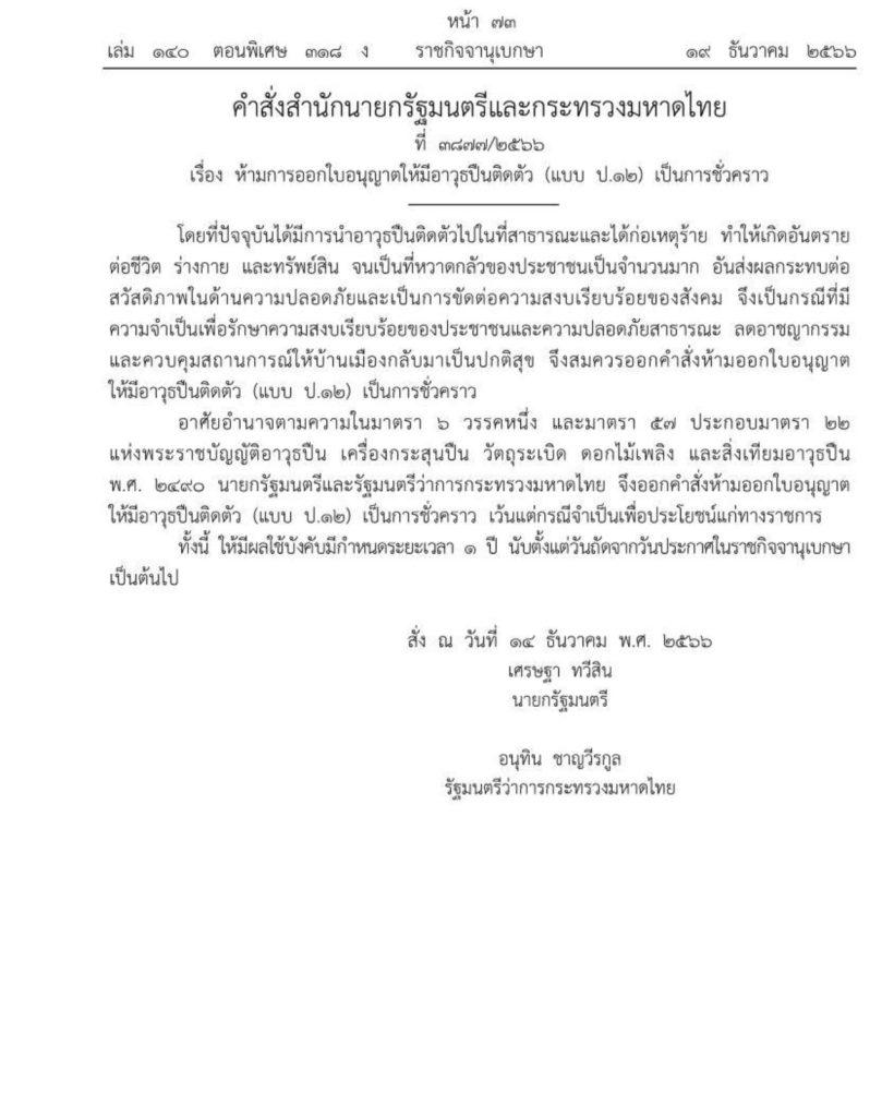คำสั่งนายกรัฐมนตรีและรัฐมนตรีว่าการกระทรวงมหาดไทย เรื่อง ห้ามการออกใบอนูญาตให้พกพาอาวุธปืนติดตัว แบบ ป.12 ชั่วคราว